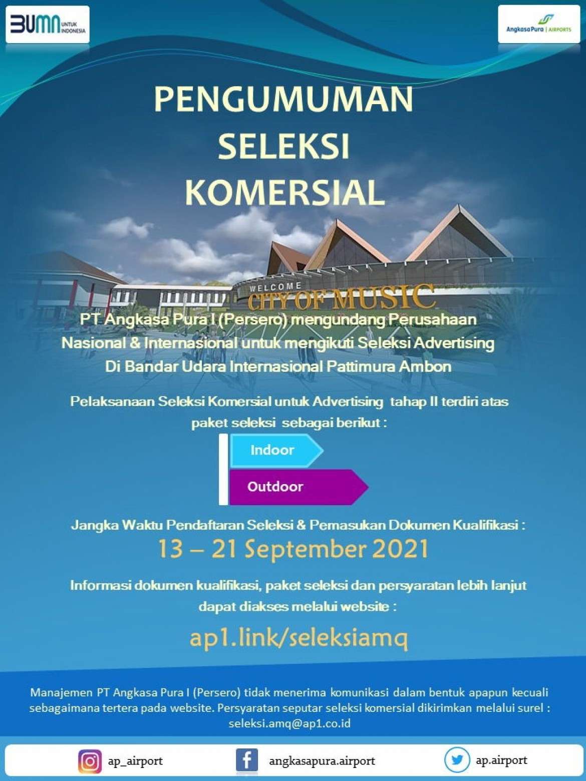 Selanjutnya untuk pertanyaan seputar Seleksi Komersial Mitra Usaha dikirimkan melalui surel : seleksi.amq@ap1.co.id